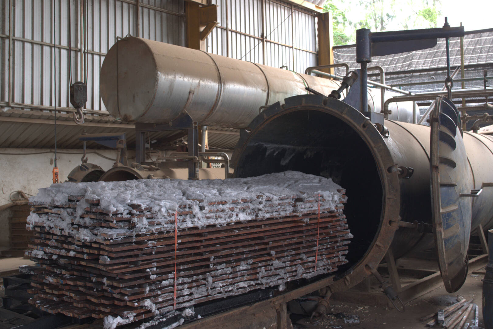 บริการของเรา Play Video Service บริการของ Akrawood บริการอัดน้ำยา สุดคุ้มค่า ให้กับลูกค้า Akrawood ทุกท่าน ติดต่อเรา บริการ การอัดน้ำยาไม้ ด้วยระบบ Vacuum Pump Hydraulic Pressure การอัดน้ำยาไม้ มีแบบจุ่มและแบบผ่านกระบวนการใช้เครื่องอัดน้ำยา แบบจุ่มน้ำยาเขียวจะเป็นที่นิยมมากในโรงเลื่อยไม้ที่ไม่มีเครื่องอัดน้ำยา และตัวไม้จะมีสีเขียว แต่ทางบริษัทอาคราวู๊ดใช้การอัดน้ำยาโดยเครื่อง สูญญากาศ ทุกครั้ง โดยทำการอัดน้ำยาอย่างถูกต้องและตามด้วย การอบน้ำยา ด้วย ตู้อบ Kiln dry เป็นกรรมวิธีเพื่อให้เกิดความสมดุลระหว่างความชื้นภายในไม้กับความชื้นภายนอกไม้ โดยทำให้น้ำหรือความชื้น ระเหยออกจากเนื้อไม้ที่สด หรือไม้ที่มีความชื้นสูง และใช้ความร้อนที่ได้จากไอร้อน จากการต้มน้ำให้เดือด เริ่มต้นจากการให้ความร้อนที่ระดับอุณหภูมิไม่สูงมากนัก (ประมาณ 60 องศาเซลเซียส) และจะค่อยๆ เพิ่มอุณหภูมิขึ้นเรื่อยๆ จนถึงอุณหภูมิที่ต้องการในเวลา 3-4 วัน (ส่วนใหญ่จะใช้อุณหภูมิไม่เกิน 90-95 องศาเซลเซียส) เพื่อ ควบคุมไม่ให้ผิวหน้าไม้แห้งเร็วเกินไปขณะที่ภายในเนื้อไม้ยังมีความชื้นสูง การอบต้องคอยควบคุมอุณหภูมิและความชื้นสัมพัทธ์ให้เหมาะสม และมี ตารางการอบไม้ซึ่งจะแปรผันตามขนาดและชนิดของไม้ และจะแตกต่างกันในแต่ละขั้นของการอบ สำหรับระยะเวลาในการอบไม้เพื่อให้มีความชื้นประมาณร้อยละ 8-12 แต่ละเตาอาจใช้เวลาประมาณ 7-15 วัน บริการ การอัดน้ำยาแบบเต็มเซลล์ (Full cell process) เป็นการอัดน้ำยาโดยมีวัตถุประสงค์ให้น้ำยาสามารถซึมเข้าไป ในเซลล์เนื้อไม้มากที่สุด เริ่มจากการนำไม้ที่ผ่านการคัดแยกแล้วบรรจุในถังอัดน้ำยาแล้วไล่อากาศและน้ำภายในเซลล์ไม้ด้วยระบบ สุญญากาศ จากนั นจึงปล่อยน้ำยาเข้าเต็มถังด้วยแรงดัน 7- 13 กิโลกรัมต่อตารางเซนติเมตร ที่อุณหภูมิ 80-100 องศาเซลเซียส เพื่อให้น้ำยาเข้าไปในเนื้อไม้ได้ทั่วทุกเซลล์ โดยใช้เวลาประมาณ 2-3 ชั่วโมง หลังจากนั้นทำการลดแรงดันและปล่อยน้ำยาออกจากถัง แล้วทำสุญญากาศอีกครั้ง บริการ บริการเลื่อยไม้ ตามขนาดที่ต้องการ เรามีบริการจัดทำเเละเลื่อยไม้ตามขนาดที่ลูกค้าต้องการ CUT TO SIZE บริการตัดไม้ตามขนาด Play Video บริการ LVL นวัตกรรม (Laminated Veneer Lumber) การเคลือบผิวแผ่นไม้อัดจะถูกทำให้แห้งและเม็ดของแผ่นไม้อัดแต่ละแผ่นนั้นจะไปในทิศทางเดียวกัน สิ่งนี้ทำให้ LVL แข็งแกร่งกว่าและสม่ำเสมอกว่าไม้เนื้อแข็งตามธรรมชาติ ในเชิงไม้แปรรูป ความทนทานที่เพิ่มขึ้นของการเป็นผลิตภัณฑ์ไม้ หมายความว่า LVL มีแนวโน้มที่จะหดตัวหรือแปรปรวนน้อยกว่า อีกทั้ง LVL ยังสามารถรองรับน้ำหนักที่มากขึ้นและขยายระยะทางไก